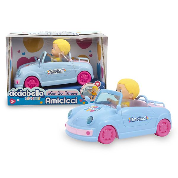 Amicicci Car es el nuevo playset de Amicicci, incluye un muñeco bebé Amicicci rubio vestido con un pañal y una camiseta extraíbles e intercambiables; y un coche de color azul con las ruedas rosas móviles. En su interior entran hasta 2 muñecos Amicicci, una niña o un niño Amicicci. Además tiene un maletero abatible para poder guardar accesorios.