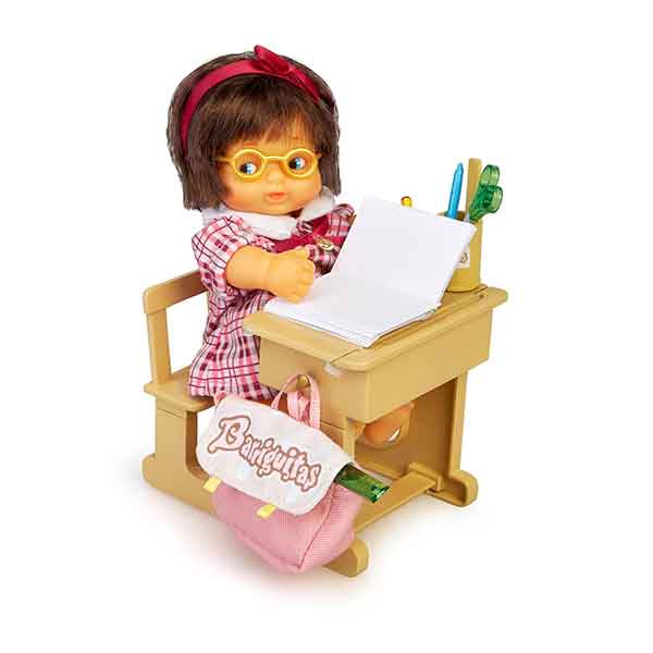 ¡En el encontrarás todo lo que hay en un cole de verdad! Dos escritorios, una pizarra con dos tizas (blanca y rosa) y un borrador, una mochila, dos libros, 4 lápices, 2 portalápices, un globo terráqueo, una regla, escuadra, tijeras, una brújula y una papelera.