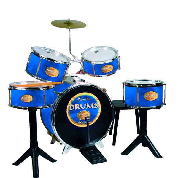 Conjunto batería compuesto de bombo, tambores de dos sonidos y platillo. Caja y timbal con pié individual. Bombo a pedal y baquetas profesionales. Aros y acabados metalizados. Montaje completamente seguro para los niños .Edad recomendada: +4 años. Diámetro bombo: 38 cm.
