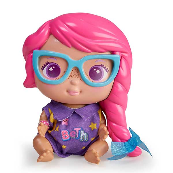 Los Mini Bellies son los hermanos traviesos de los Bellies .Aquí llega Mini Beth, viene con sus famosas gafas y su mono morado. Trae un pañal y un pañal extra con purpurina. Incluye un biberón verde.