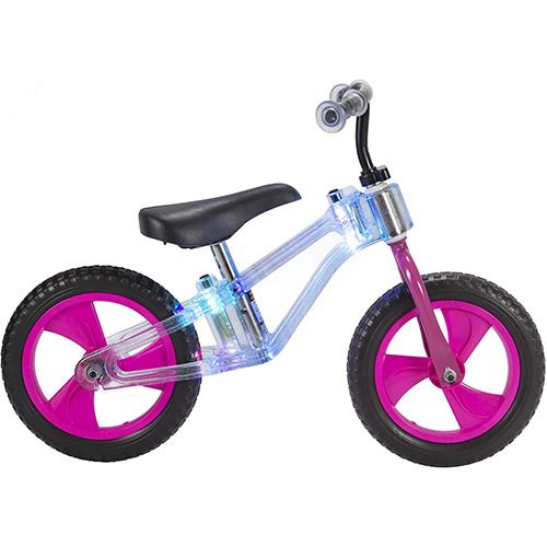 Bicicleta infantil sin pedales Balance Bike de color rosa con tamaño de ruedas de 12 pulgadas y luces LED.