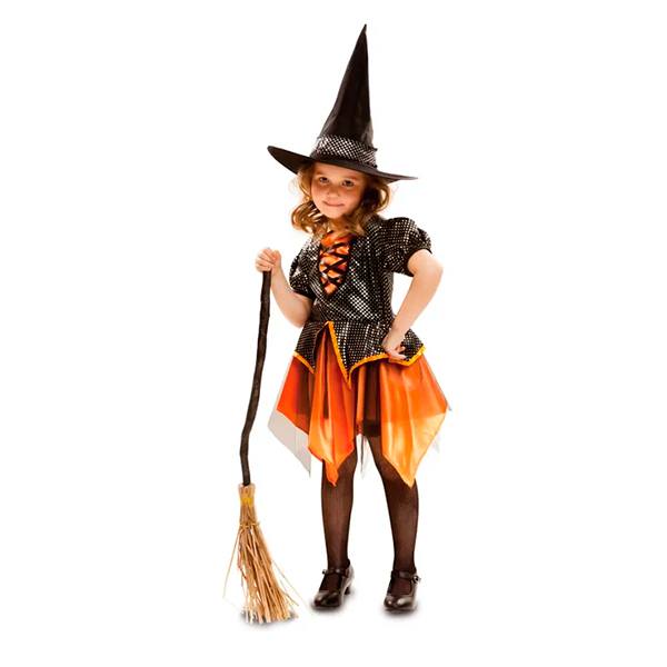 Disfraz de bruja dorada que incluye sombrero y vestido.
