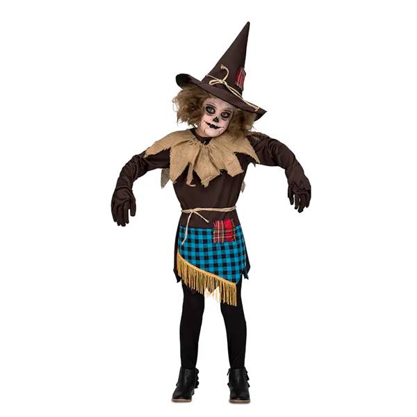 Disfraz de espantapájaros que incluye vestido, cuello, cinturón, guantes y sombrero.