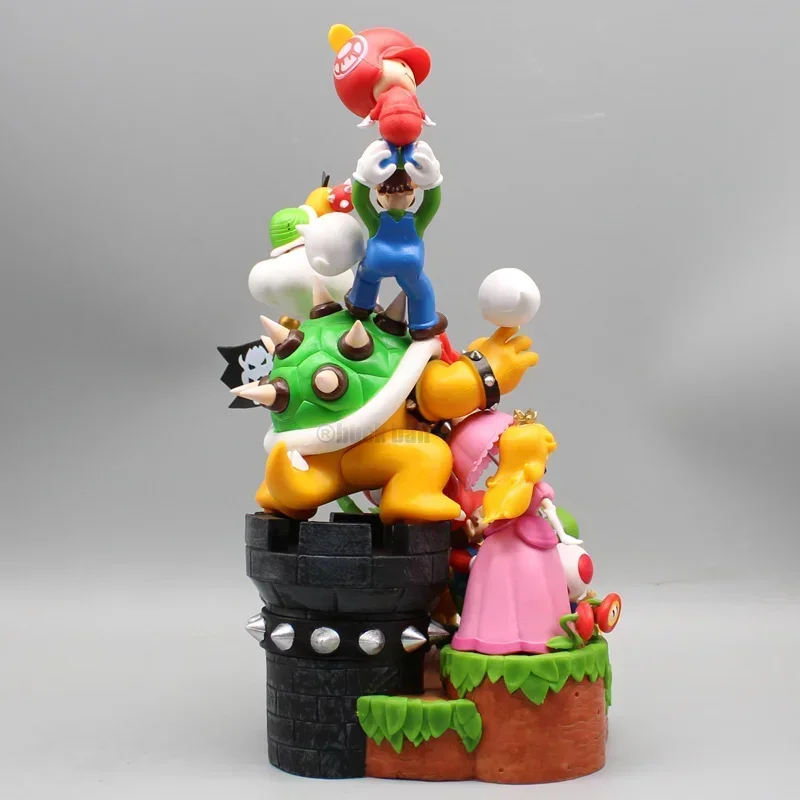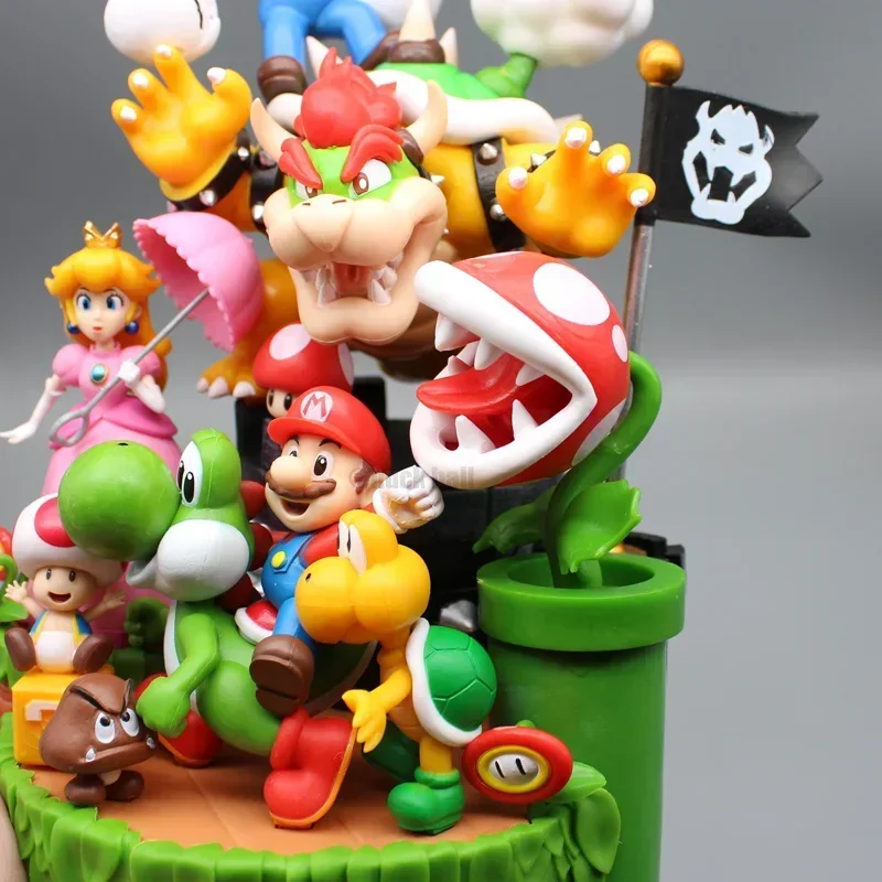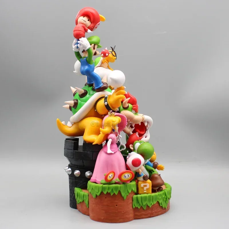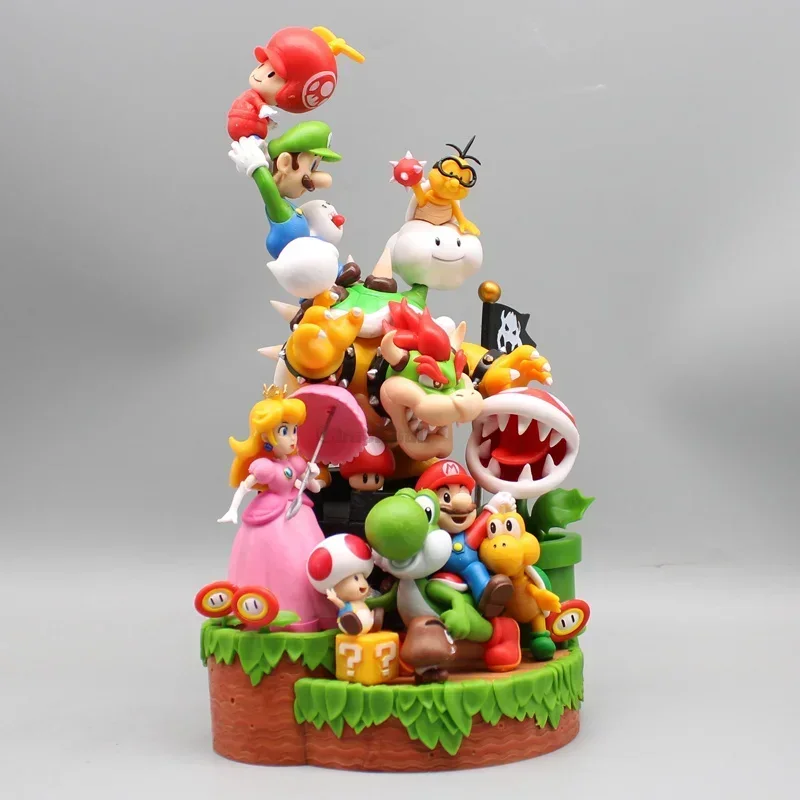 Esta figurita representa una adorable escena con toda la familia y amigos de Super Mario. Mide aproximadamente 27 cm y en ella aparecen muchos personajes populares de la franquicia, como Mario, Luigi, la princesa Peach, Toad, Yoshi y muchos más.