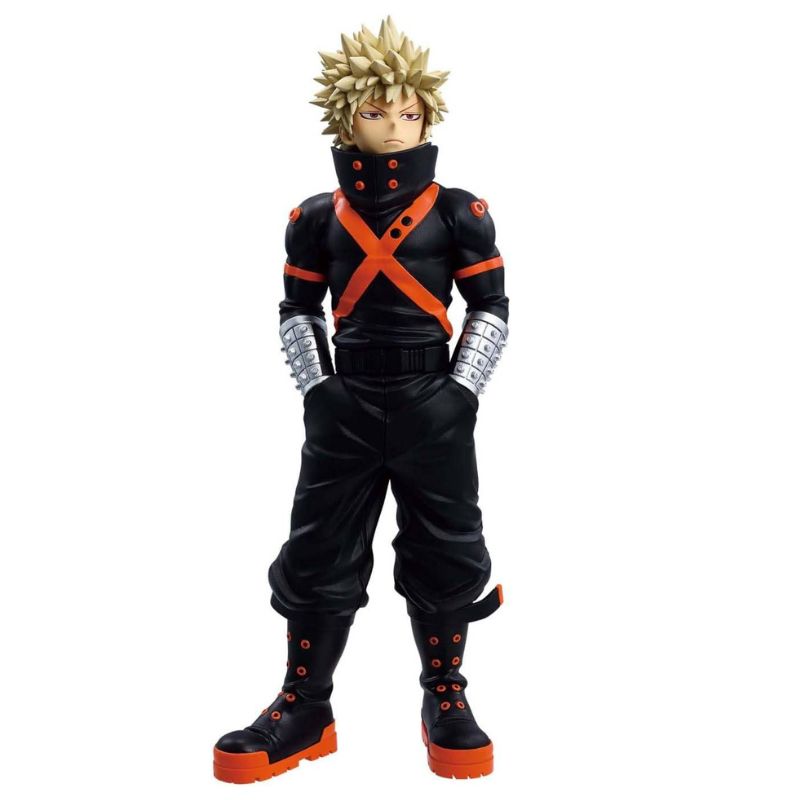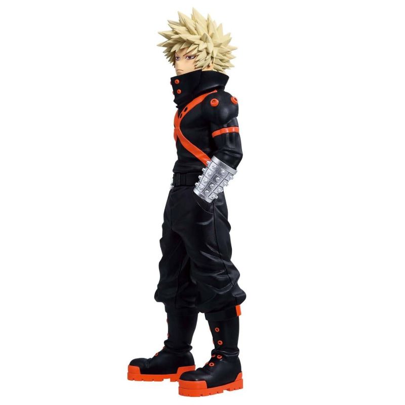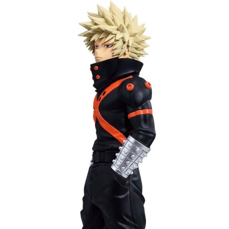 Cada aspecto de esta figura ha sido meticulosamente esculpido y pintado para reflejar la apariencia icónica de Bakugo. Desde su característico cabello rubio y erizado, hasta los intrincados detalles de su traje de héroe negro con acentos naranjas y sus distintivos guantes de granada, la atención al detalle es excepcional. La calidad de la escultura y la pintura realzan su pose confiada y su aura explosiva.