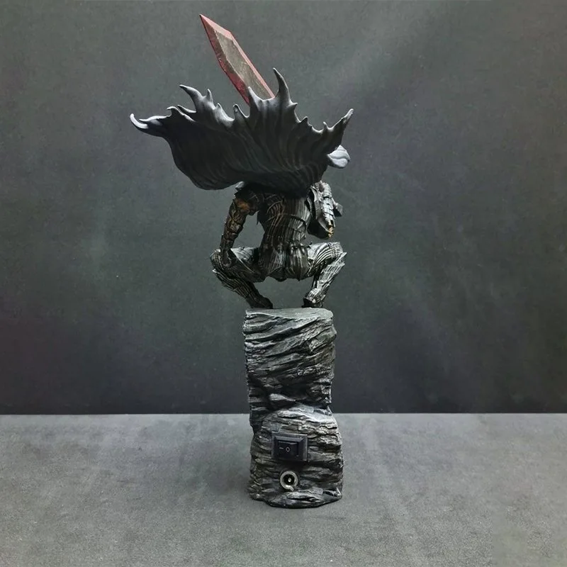 La figura está esculpida con gran detalle, incluyendo la armadura, la espada y el rostro de Guts.