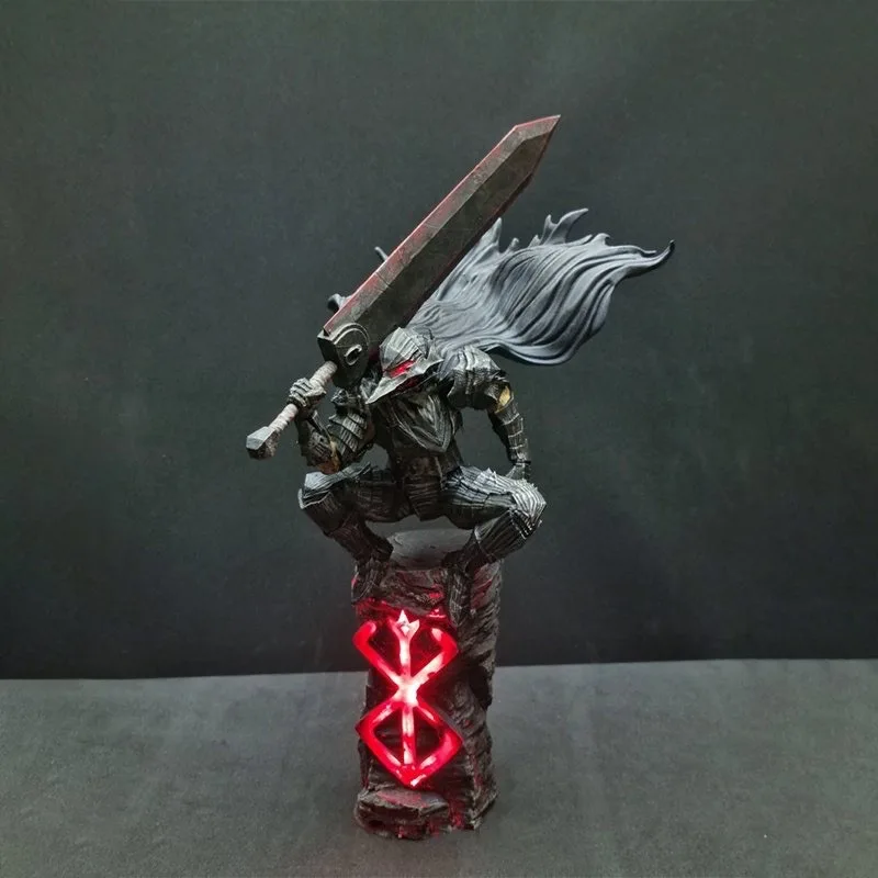 La figura representa a Guts, el protagonista de la serie manga Berserk. Guts es un guerrero imponente y musculoso que viste una armadura negra y porta una gran espada. Tiene una mirada decidida y un aire feroz. La figura está de pie sobre una roca con una luz roja de fondo, lo que crea una atmósfera oscura y amenazadora.