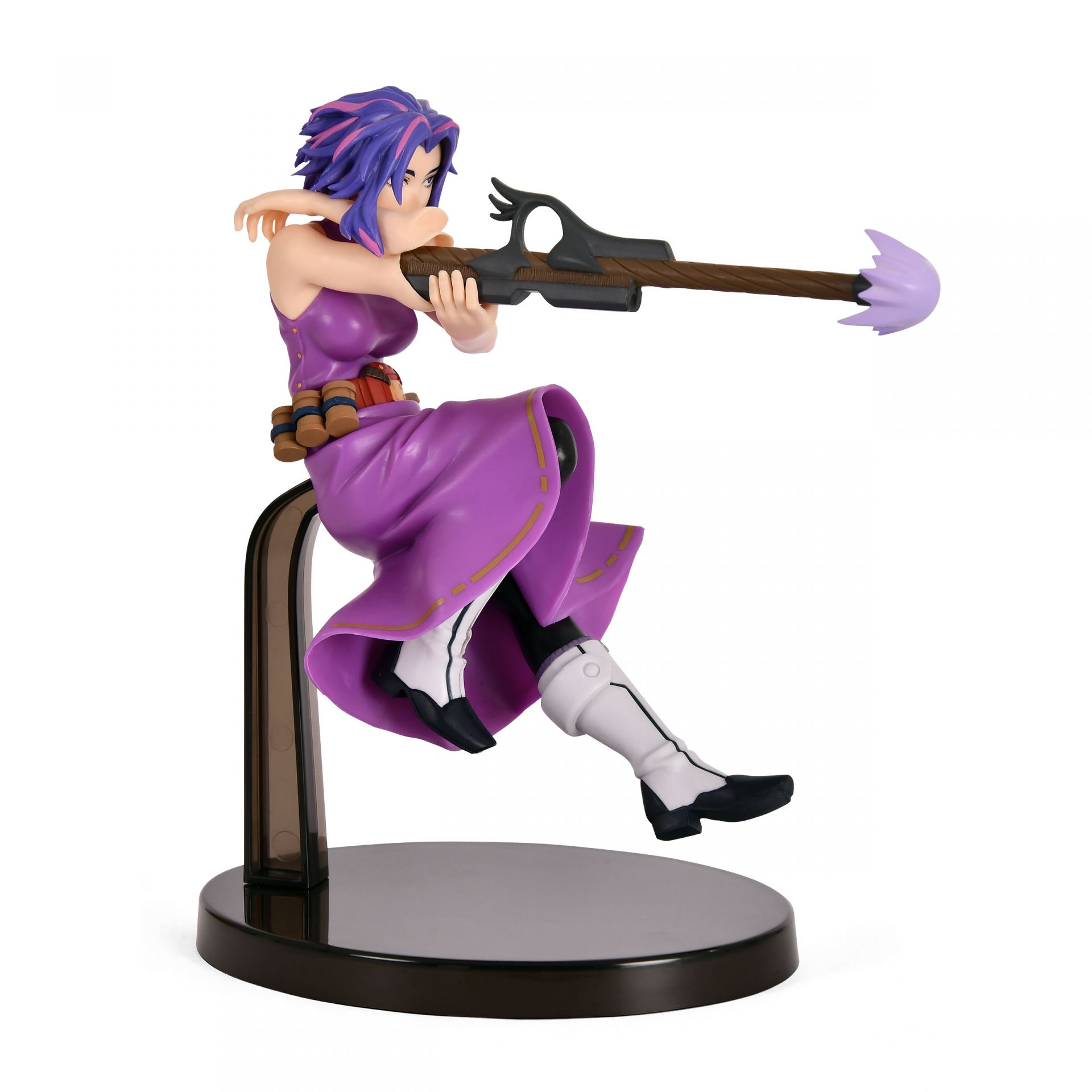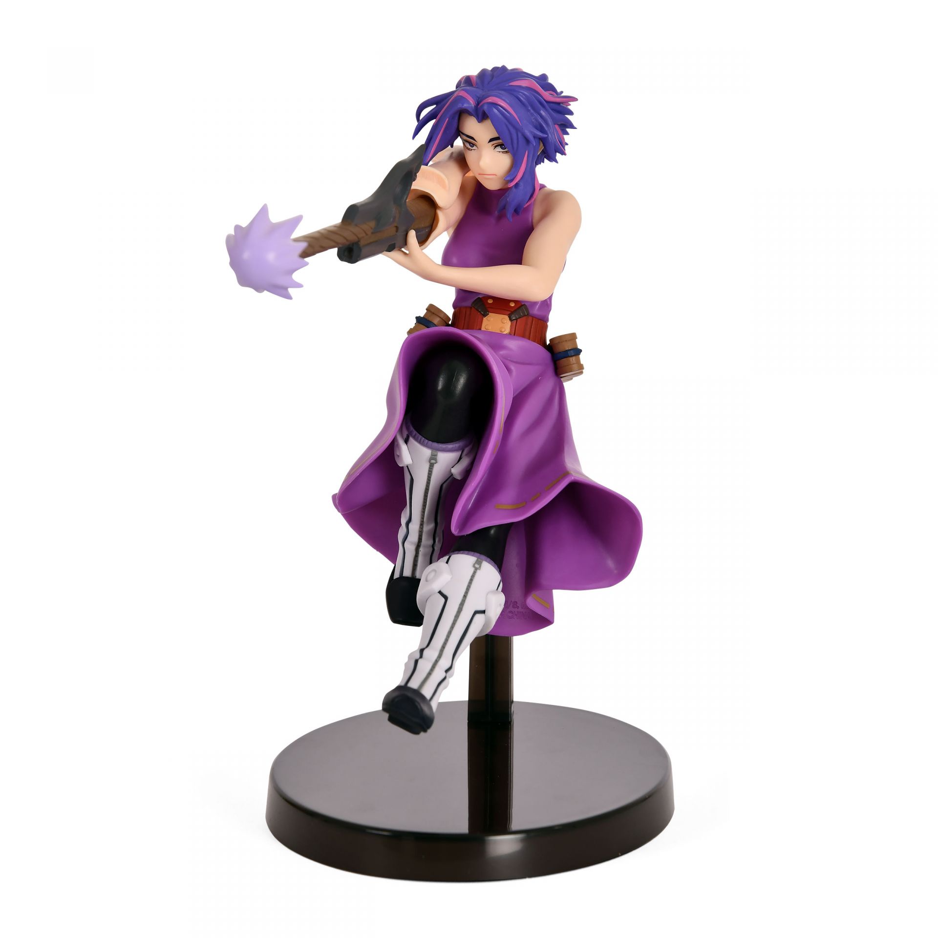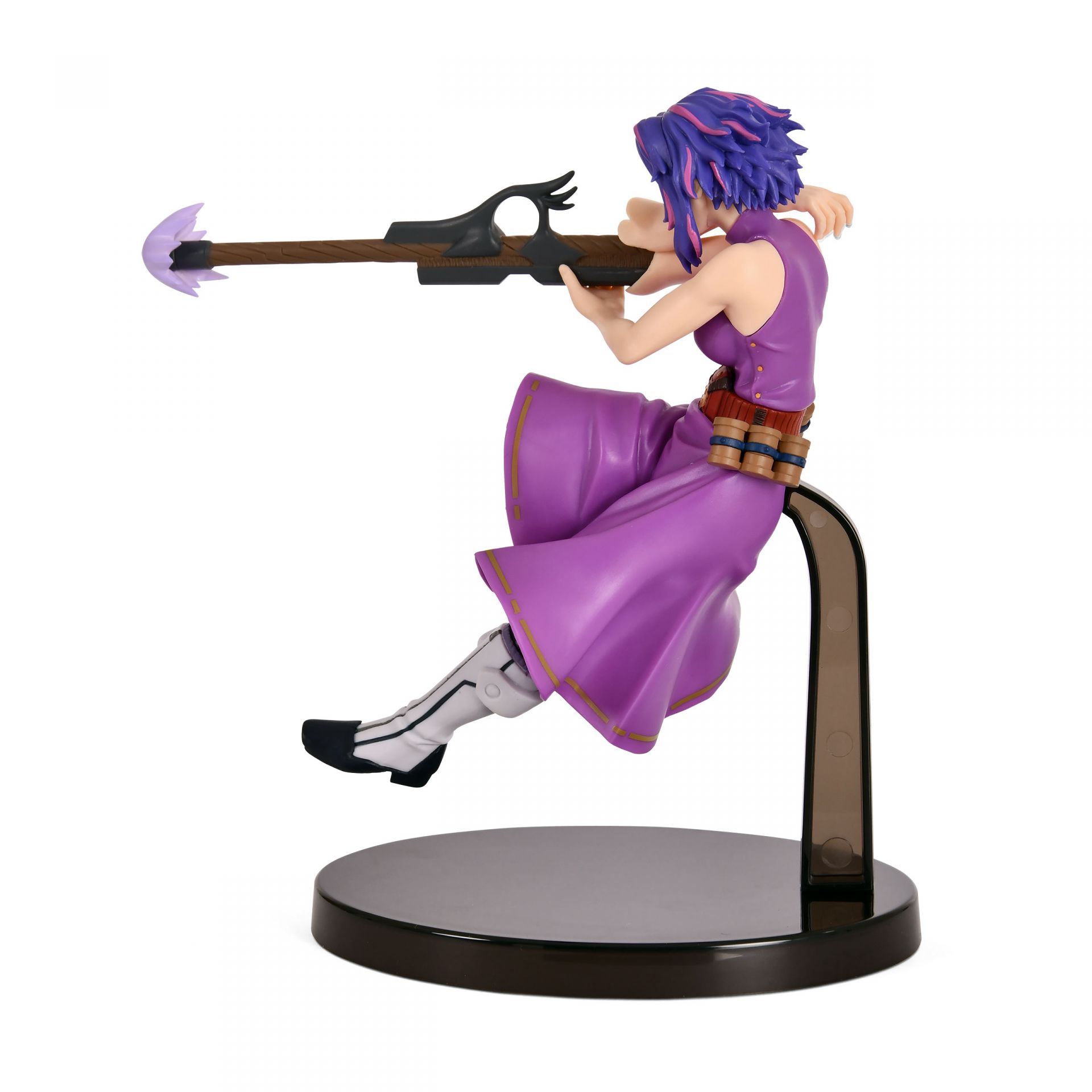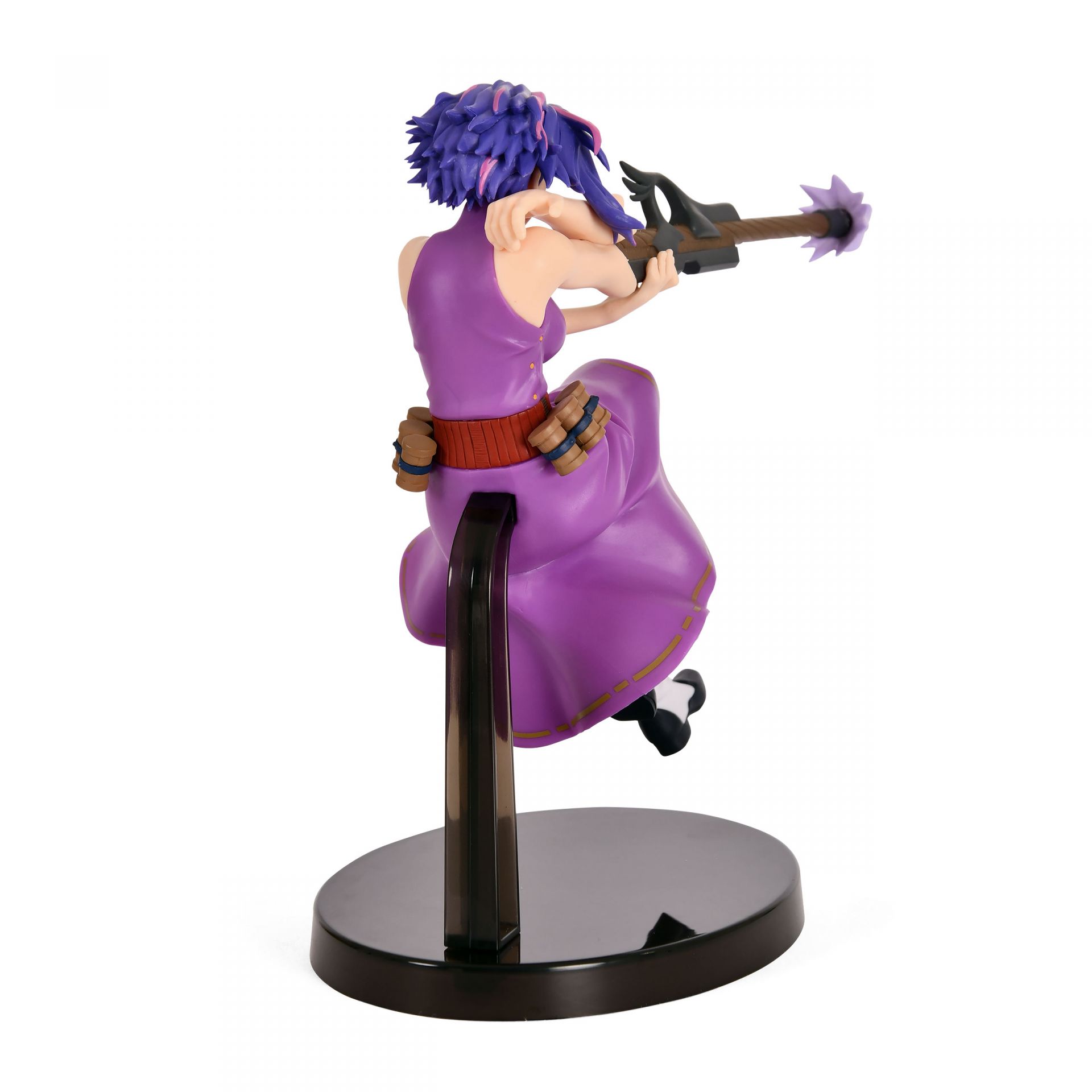 Cada aspecto de esta figura ha sido meticulosamente esculpido para reflejar la apariencia distintiva de Lady Nagant. Desde su llamativo cabello morado con toques rosados y su equipo de combate, hasta el efecto de disparo que emana de su brazo, la atención al detalle es excepcional. La calidad de la escultura y la pintura realzan su expresión decidida y su aura de peligro, haciendo de esta figura una pieza visualmente cautivadora.
