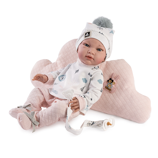 Guca Muñeca Recién Nacida Cintia 40 cm Sexuado – Boutique : camiseta blanca y pantalón rosa, cojin nube.