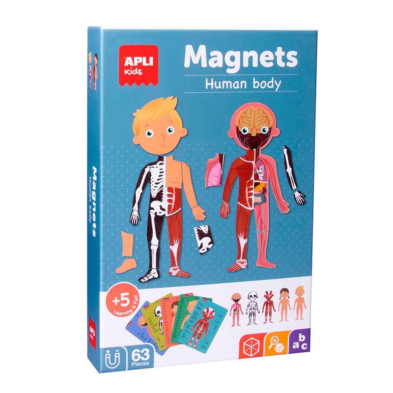 Contenido: 1 escenario imantado de 28 x 18 cm y 63 fichas magnéticas con las diferentes partes del cuerpo humano, el esqueleto, los órganos y los músculos. Incluye 15 fichas con información detallada en 16 idiomas distintos.