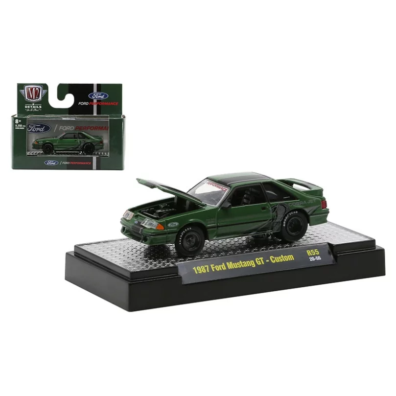 M2 Machines sorprende a todos con uno de sus casting’s más gustados el Mustang Fox Body, el mismo viene completamente metálico con llantas de goma Goodyear con rines en color negro, movilidad en su capó y su icónico color verde bosque con tampos de Cobra Jet y Ford Performance que le da un toque extra de deportividad. Cada una de sus lámparas son de cristal y todos sus emblemas bien fabricados. Interiores negros y viene en caja acrílica para una mejor presentación.