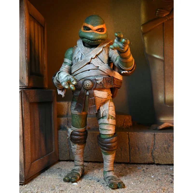 - Miguel Ángel como La Momia vuelve a imaginar a la Tortuga como La Momia, despertada de su sueño eterno por un amor eterno… ¡por la pizza! ¡No te retrases con su pastel o puedes entrar en conflicto con la maldición de la momia!