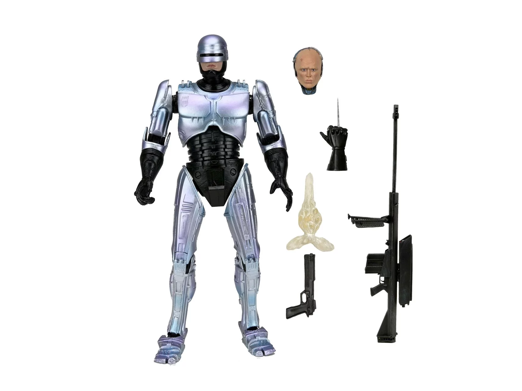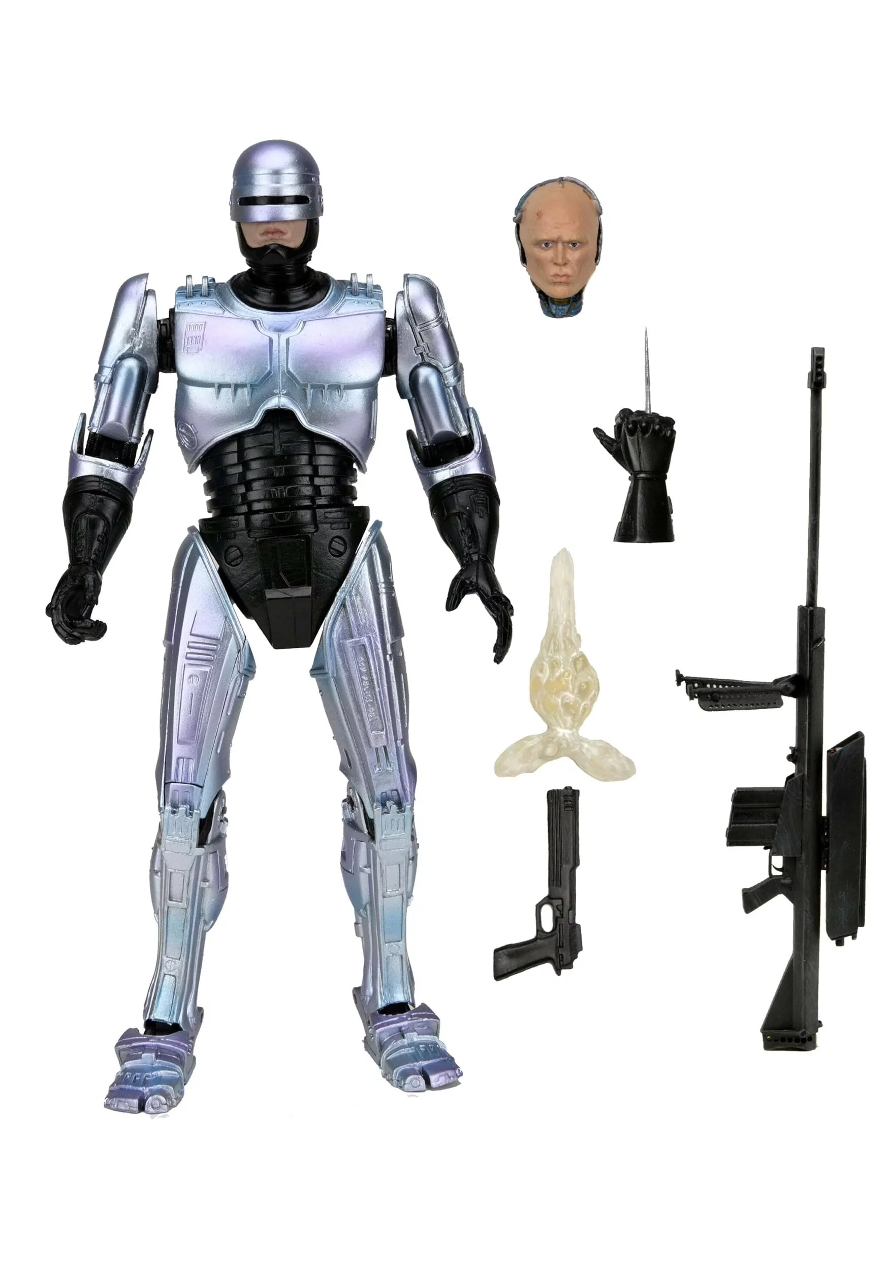 Parte hombre. Parte máquina. Todo policía. ¡Para el 35 aniversario de la película clásica de culto RoboCop en 2022, el luchador contra el crimen del futuro Detroit recibe el tratamiento Ultimate de NECA! Enfréntate a criminales y droides de ejecución deshonestos por igual con una variedad de accesorios: puño de punta de datos intercambiable, pistola Auto-9 que cabe en una funda de pierna con resorte oculta, cañón de asalto Cobra, efecto de explosión de boca acoplable y una cabeza intercambiable adicional con la semejanza de Peter Weller. Esta figura a escala de 7” cuenta con decoración mejorada e impresión digital. Viene en un empaque de caja con ventana apto para coleccionistas con solapa de apertura