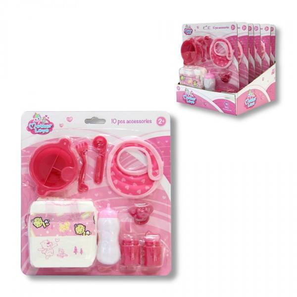 Set para muñecas que incluye pañales y accesorios como babero, chupete, biberón, plato y cubiertos y dos botes.