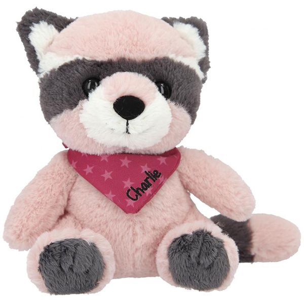 Mapache de peluche Charlie, super suave y de color rosa y gris con ojos de botón negros.