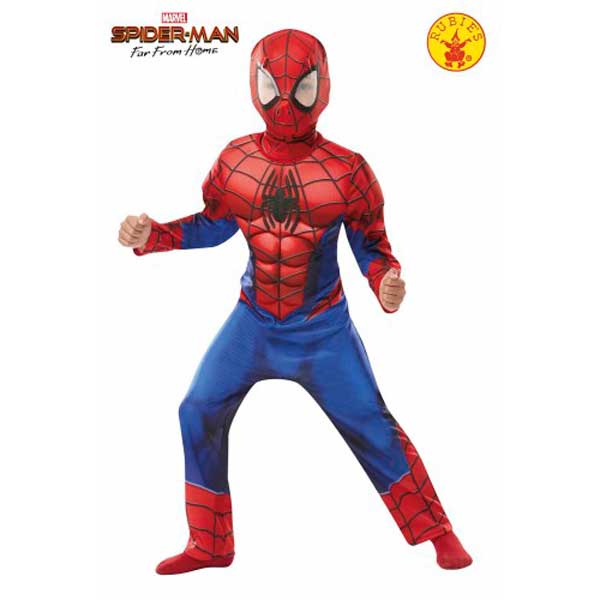 Disfraz infantil Spiderman Deluxe compuesto por un mono con pecho acolchado y máscara de tela.